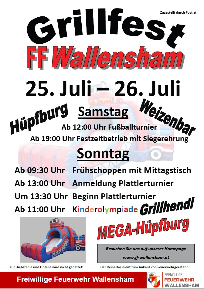 Am 25. und 26. Juli 2026 findet das jährliche Grillfest der FF Wallensham wieder statt.