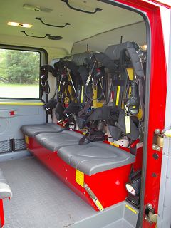 In der ersten Sitzbank lagern Reserveflaschen fĂŒr den schwerem Atemschutz, Notrettungsset mit der Rettungsleine und Reserve Atemschutzmasken.